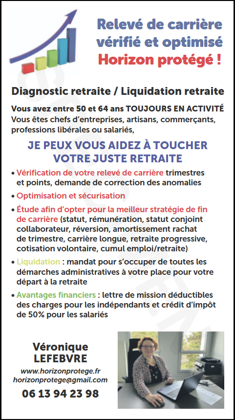 Horizon Protégé, c'est l'accompagnement retraite de Véronique Lefebvre : 25 ans d'expérience en protection sociale pour aider les dirigeants, cadres et salariés à y voir clair sur leur retraite et à sécuriser leur départ.